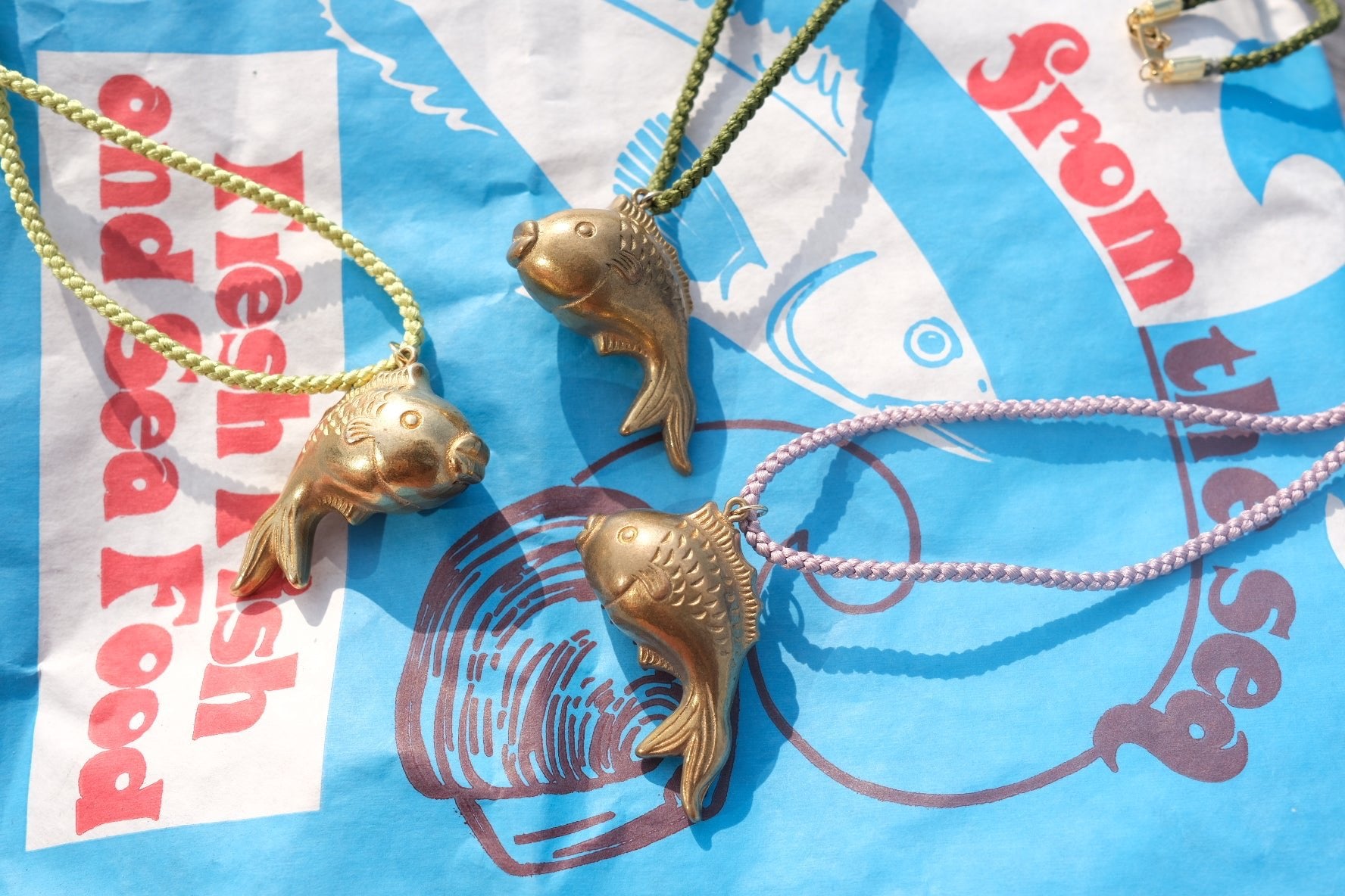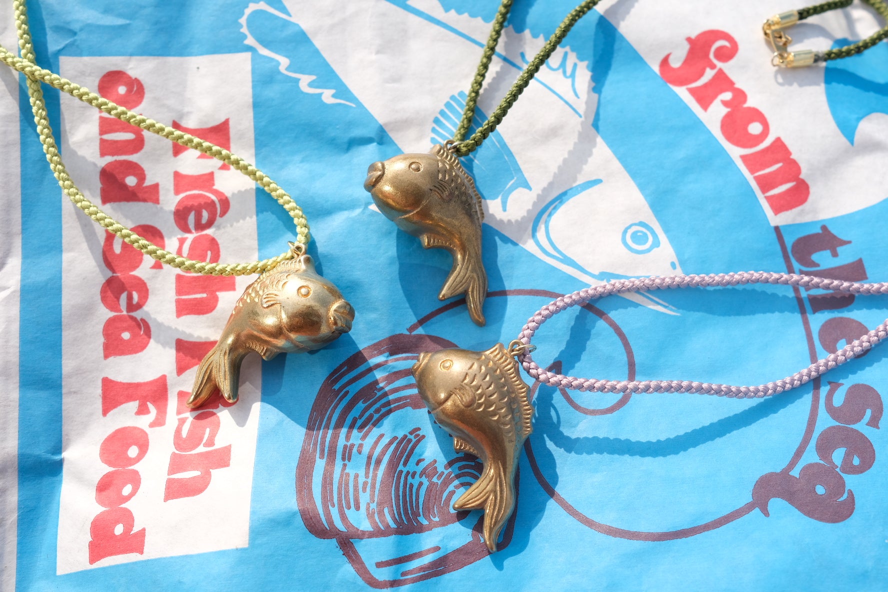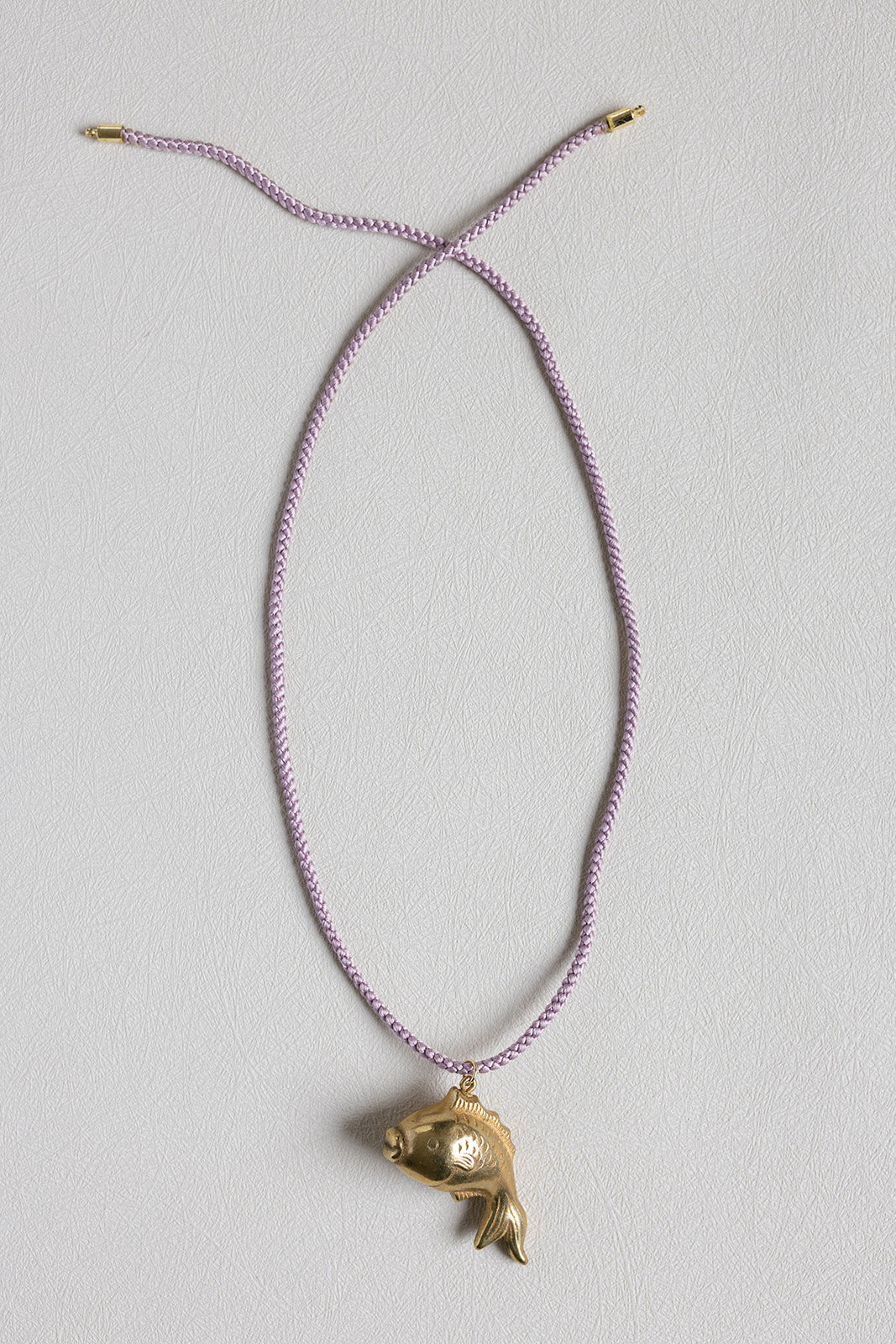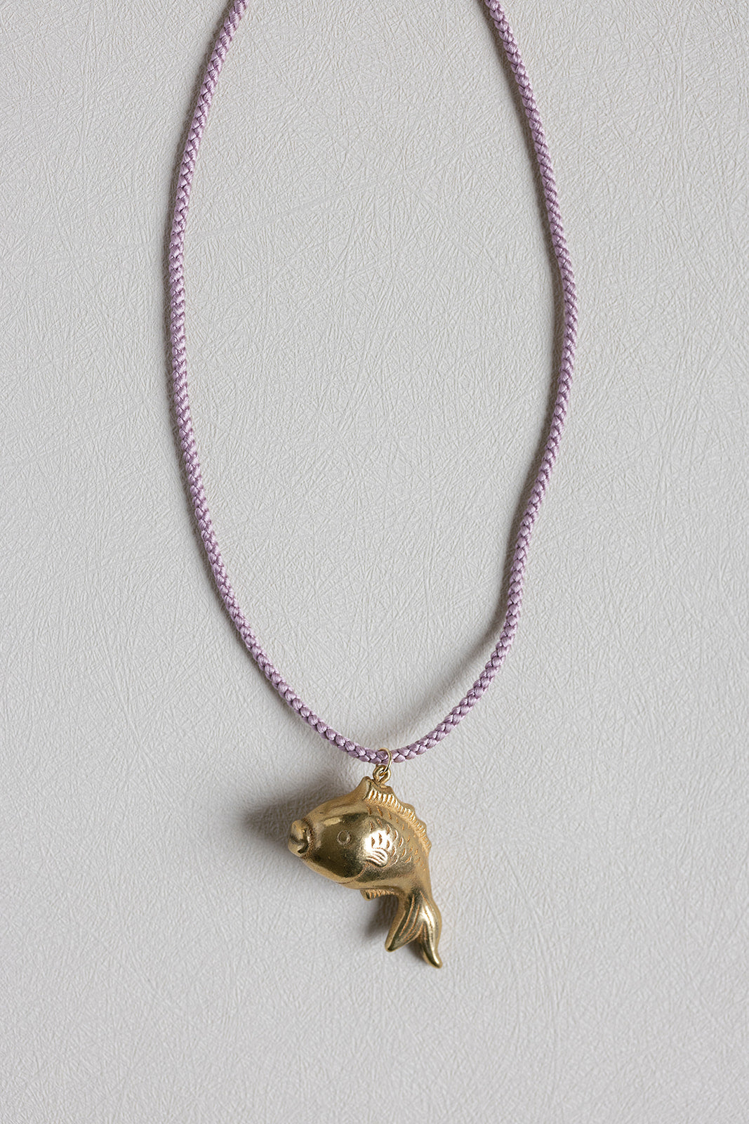 Add a splash of fun to your jewelry collection with this vintage-inspired shiny gold fish charm, paired with a hand-braided silk cord. Available in Lilac, Green, and Forest Green.